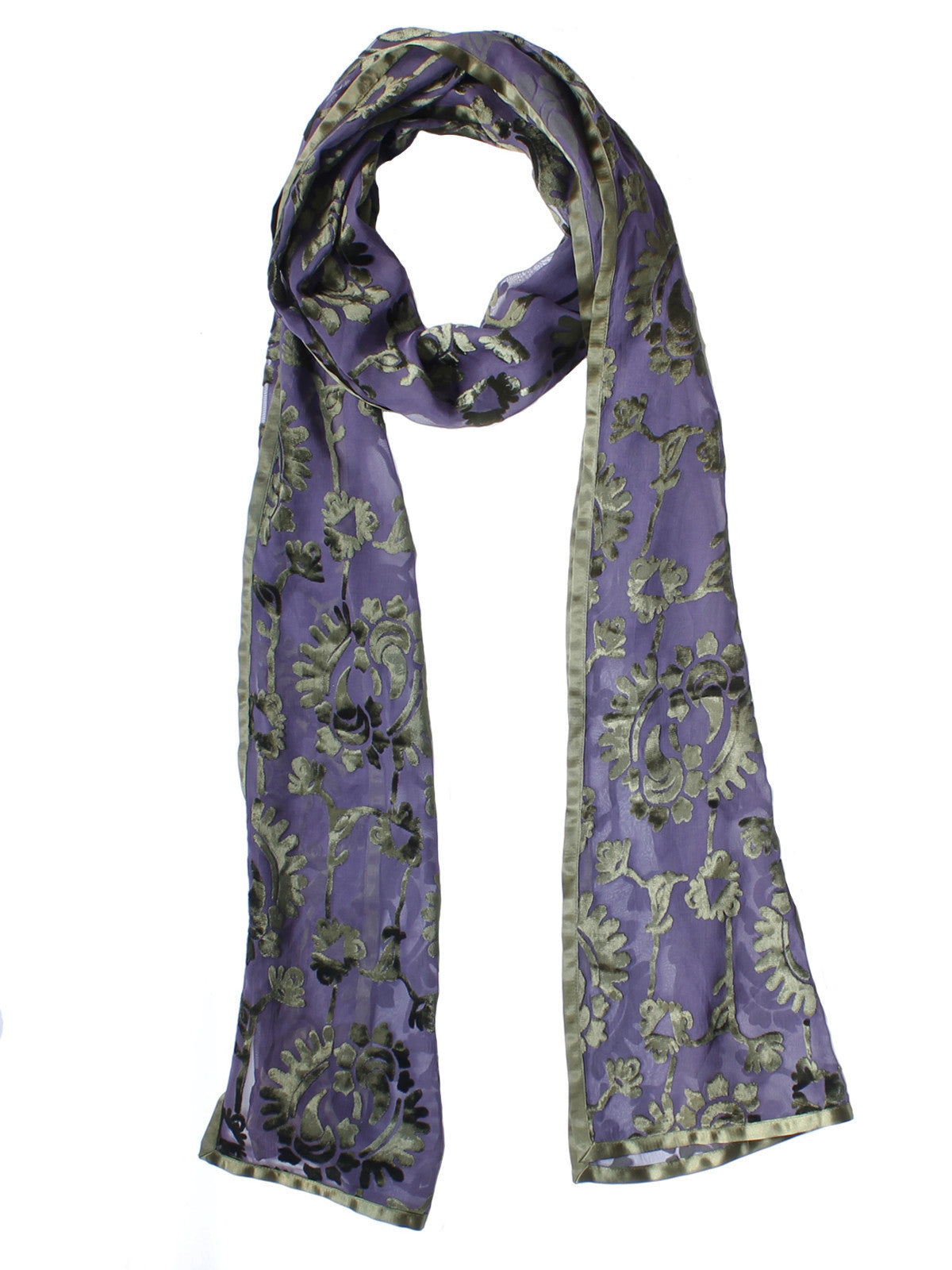 Silk velvet burnout in floral pattern.  Available in lavendar/green.